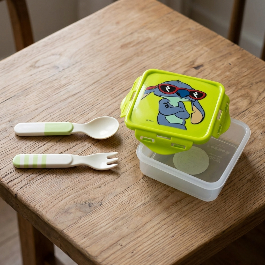 Combo Hermético Stitch + Cubiertos Infantiles Bamboo (2 Piezas)