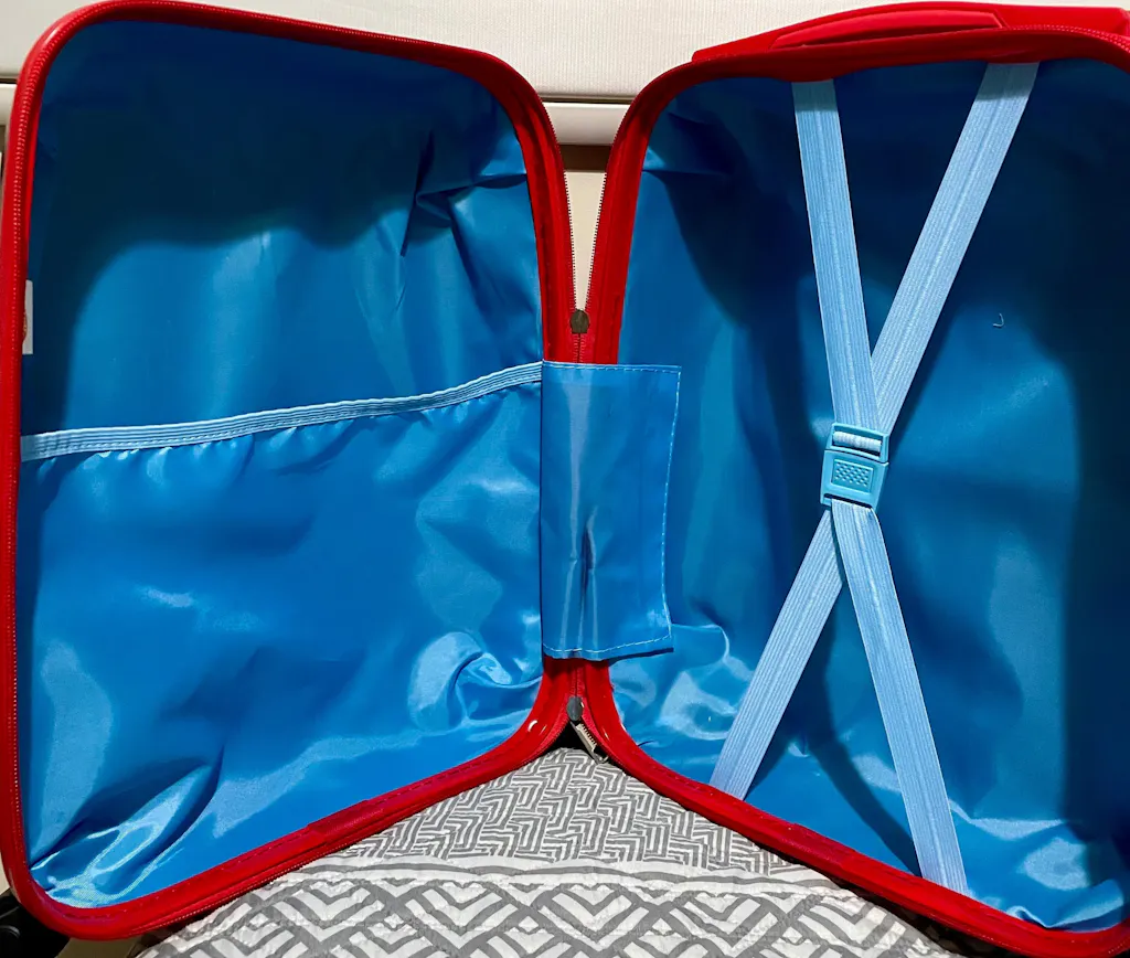 El material es un poco delgado, a lo mínimo se raya. Es de facil manejo para los niños, y por dentro tiene división en ambos costado. Lo mas importante es que, la pude usar en viaje de avión con la compañía Sky sin problema :)