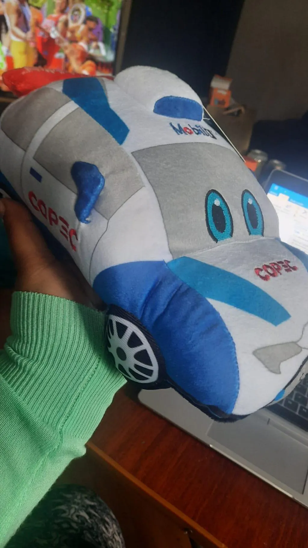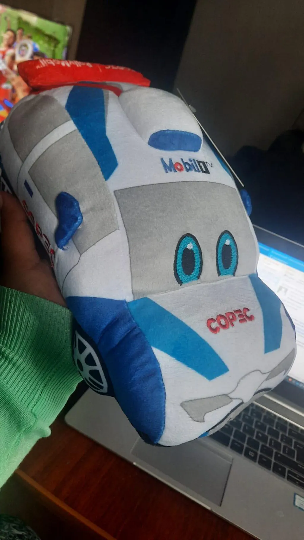 Es suave, blandito, no suelta pelusas, ideal para los pequeños, el alerón trasero tiene textura, se puede apretar y su relleno suena. La costura de los espejos es fuerte, no tiene riesgo de que las arranque.